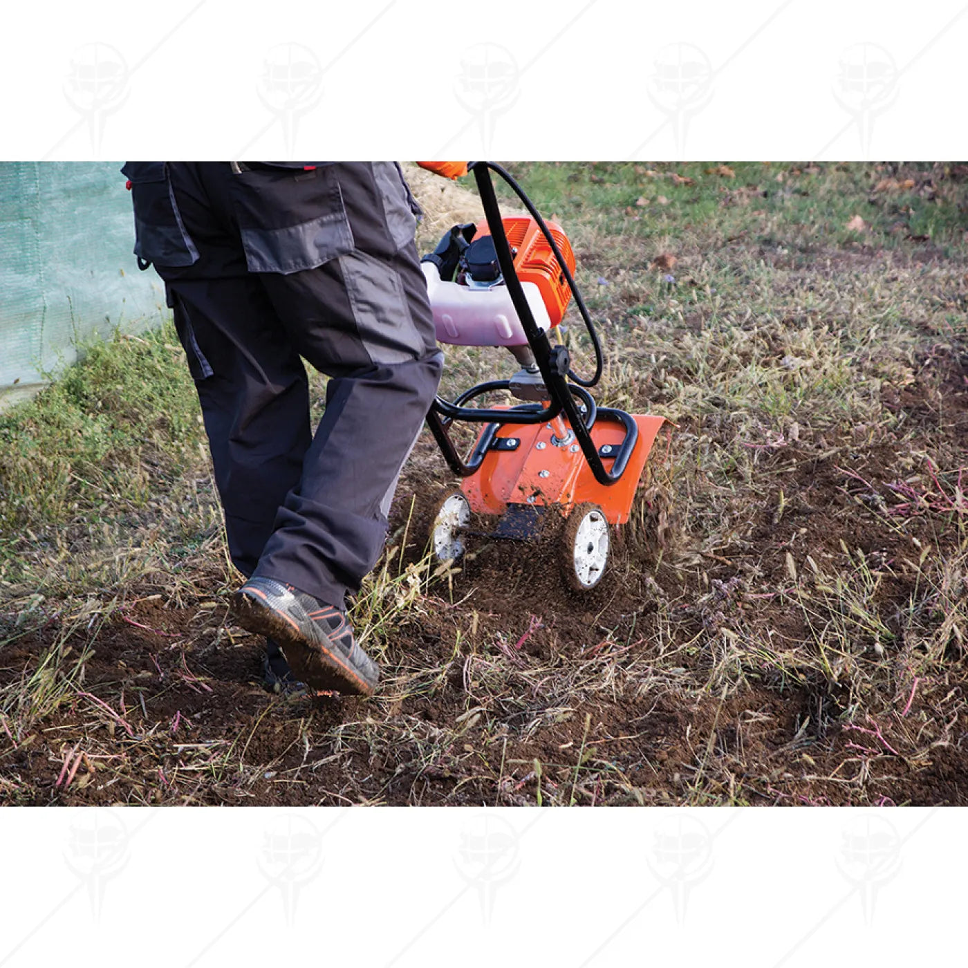 Бензинова мини мотофреза 52CC, 2.2Kw. Фрезоването е труден процес свързан с боравене на големи машини и много сила при третирането на почвата. С тази машина лесно и ефективно може да фрезовате посредством мощния 2,2Kw мотор. Мотофрезата също лесно се разглобява до такова положение, че може да се събере в багажник на автомобил. Двутактов двигател с въздушно охлаждане. Разглобяеми дръжки за по-лесен транспорт и съхранение. Машината предлага оптимална дълбочина на фрезоване 11см, ширина на работната част 33см. Ергономичният и компактен дизайн на мини фрезата и специално проектираните колела за по-лесна работа гарантират висока ефективност.